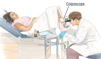 Colposcope is a magnification instrument which examines the cervix from outside the vagina and it magnifies the cervix. Cervix is painted with weak acetic acid which causes the abnormal cells to turn white. Both iodine and acetic acid are used. The pattern will help decide if you have a low grade changes or high grade changes. We may remove a small tissue sample from abnormal looking area and a special solution will be applied to stop the bleeding from the biopsy area. After the biopsy, you may have minor amount of bleeding and vaginal discharge for a week. Avoid sex, tampons or bath for 2 weeks to allow the cervix to heal.